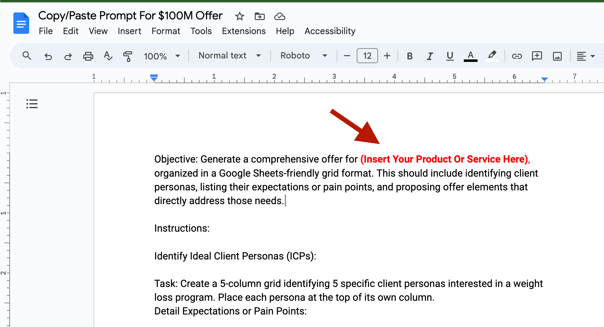 Step 4: Click the button to pull up the Google Doc with the offer creation prompt.