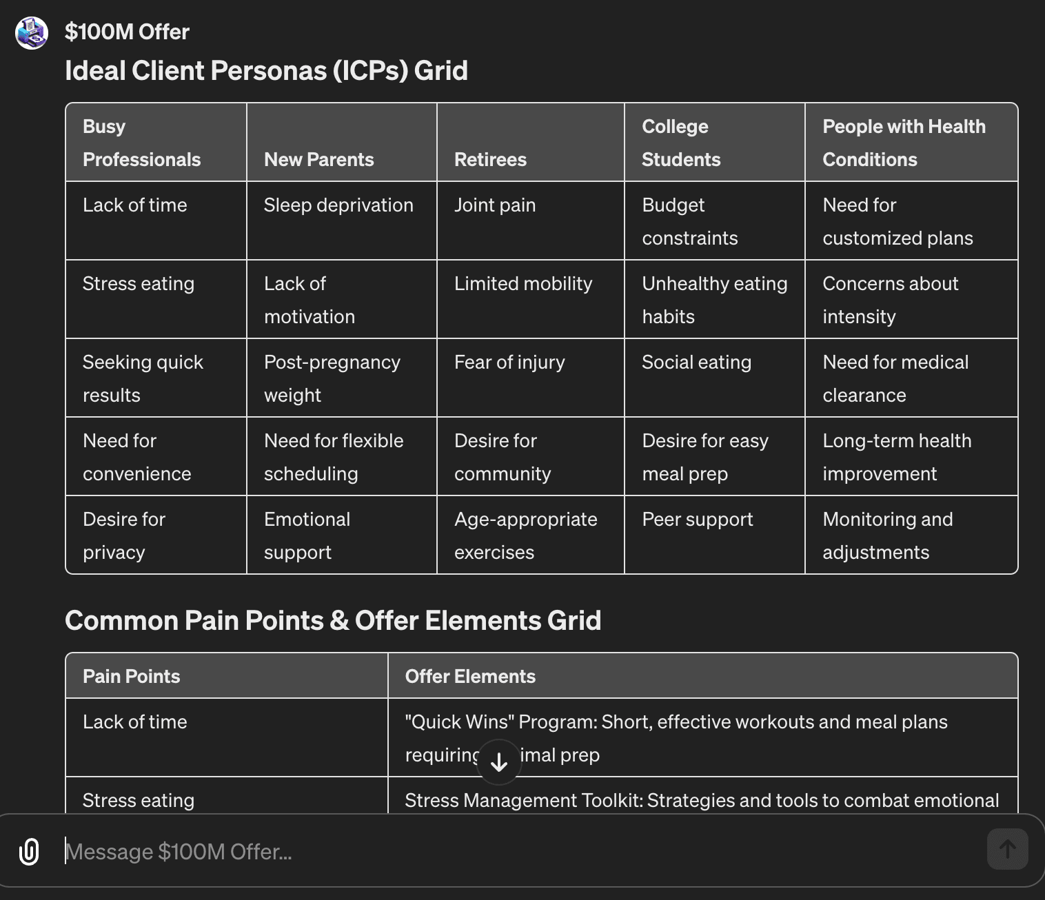 Step 8:Hit "Enter". You'll see your top 5 ICPs, their individual pain points, the most common pain points amongst them, and the inverse of each of those most common pain points represented as a hypothetical offer stack element. This is for internal consideration only (you don't have to actually create these assets on your side). Copy/Paste this into the appropriate spot in the Offer Creation worksheet.