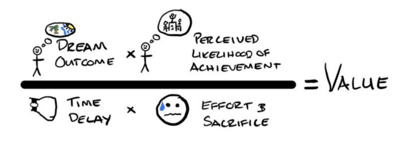 You can think of the value your offer provides in the terms illustrated below by 9 figure entrepreneur, Alex Hormozi. The price should be the last thing we figure out here. We want to identify the value someone will achieve via the vehicle of your product or service.